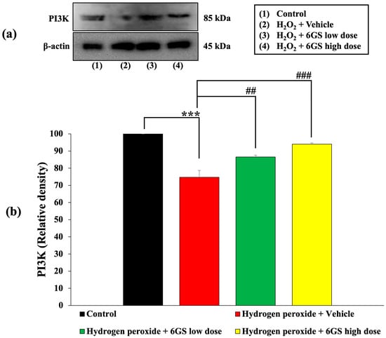 Effect of 6GS on the expression of PI3K in H2O2-induced SH-SY5Y cell toxicity was detected by Western blotting. (a) Representative Western blot showing the levels of PI3K. (b) Relative density of PI3K. Data are presented as mean ± SEM. *** p < 0.001, compared to the control; ##,### p < 0.01 and 0.001, respectively, compared to SH-SY5Y cells treated with H2O2 and vehicle. H2O2: hydrogen peroxide at a dose of 200 μM; 6GS low dose and 6GS high dose: phytosome-encapsulated 6-gingerol- and 6-shogaol-enriched extracts from Zingiber officinale Roscoe at doses of 15.625 and 31.25 μg/mL, respectively.