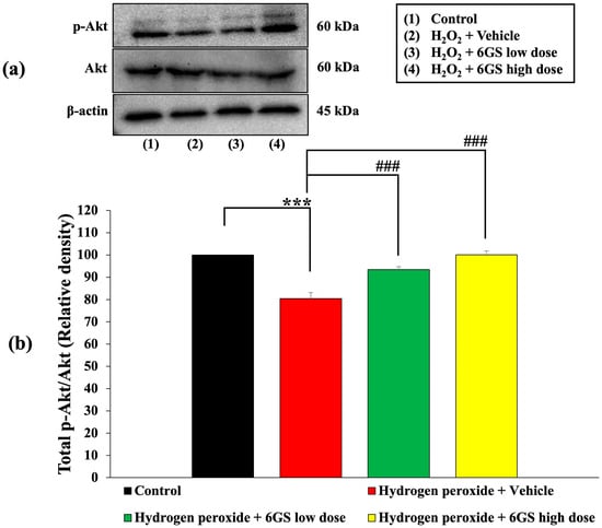 Effect of 6GS on the expression of p-Akt/Akt in H2O2-induced SH-SY5Y cell toxicity was detected by Western blotting. (a) Representative Western blot showing the levels of p-Akt/Akt. (b) Relative density of p-Akt/Akt. Data are presented as mean ± SEM. *** p < 0.001, compared to the control; ### p < 0.001, compared to SH-SY5Y cells treated with H2O2 and vehicle. H2O2: hydrogen peroxide at a dose of 200 μM; 6GS low dose and 6GS high dose: phytosome-encapsulated 6-gingerol- and 6-shogaol-enriched extracts from Zingiber officinale Roscoe at doses of 15.625 and 31.25 μg/mL, respectively.