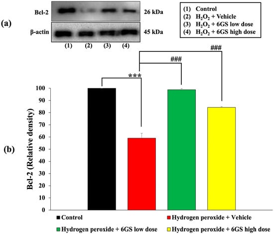 Effect of 6GS on the expression of Bcl-2 in H2O2-induced SH-SY5Y cell toxicity was detected by Western blotting. (a) Representative Western blot showing the levels of Bcl-2. (b) Relative density of total Bcl-2. Data are presented as mean ± SEM. *** p < 0.001, compared to the control; ### p < 0.001, compared to SH-SY5Y cells treated with H2O2 and vehicle. H2O2: hydrogen peroxide at a dose of 200 μM; 6GS low dose and 6GS high dose: phytosome-encapsulated 6-gingerol- and 6-shogaol-enriched extracts from Zingiber officinale Roscoe at doses of 15.625 and 31.25 μg/mL, respectively.