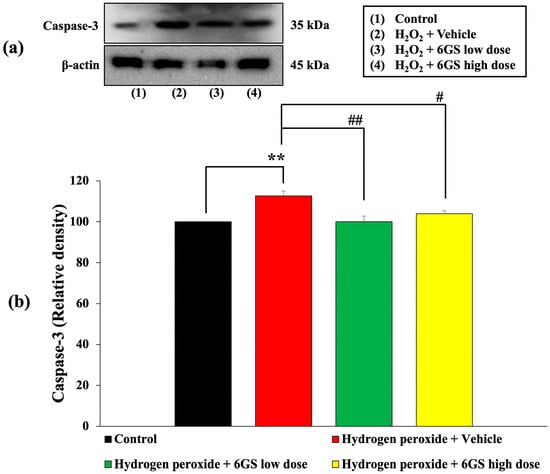Effect of 6GS on the expression of caspase-3 in H2O2-induced SH-SY5Y cell toxicity was detected by Western blotting. (a) Representative Western blot showing the levels of caspase-3. (b) Relative density of caspase-3. Data are presented as mean ± SEM. ** p < 0.01, compared to the control; #,## p < 0.05 and 0.01, respectively, compared to SH-SY5Y cells treated with H2O2 and vehicle. H2O2: hydrogen peroxide at a dose of 200 μM; 6GS low dose and 6GS high dose: phytosome-encapsulated 6-gingerol- and 6-shogaol-enriched extracts from Zingiber officinale Roscoe at doses of 15.625 and 31.25 μg/mL, respectively.