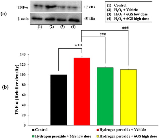 Effect of 6GS on the expression of TNF-α in H2O2-induced SH-SY5Y cell toxicity was detected by Western blotting. (a) Representative Western blot showing the levels of TNF-α. (b) Relative density of TNF-α. Data are presented as mean ± SEM. *** p < 0.001, compared to the control; ### p < 0.001, compared to SH-SY5Y cells treated with H2O2 and vehicle. H2O2: hydrogen peroxide at a dose of 200 μM; 6GS low dose and 6GS high dose: phytosome-encapsulated 6-gingerol- and 6-shogaol-enriched extracts from Zingiber officinale Roscoe at doses of 15.625 and 31.25 μg/mL, respectively.