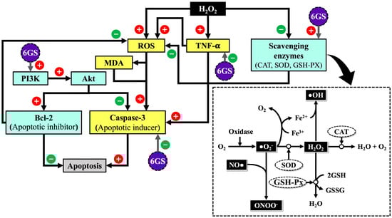 The schematic diagram demonstrates the neuroprotective potential of 6GS in H2O2-induced SH-SY5Y neurotoxicity; 6GS: phytosome-encapsulated 6-gingerol- and 6-shogaol-enriched extracts from Zingiber officinale Roscoe; H2O2: hydrogen peroxide; •O2−: superoxide anion; •OH: hydroxyl radical; NO•: nitric oxide; ONOO−: peroxynitrit; ROS: reactive oxygen species; SOD: superoxide dismutase; CAT: catalase; GSH-Px: glutathione peroxidase; MDA: malondialdehyde; PI3K: phosphoinositide 3-kinase; Akt: protein kinase B; Bcl-2: B-cell lymphoma 2; and TNF-α: tumor necrosis factor-alpha.