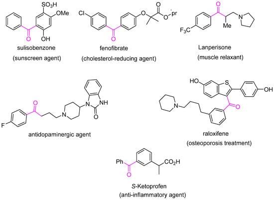 The oxidation of benzylic methylene groups to corresponding carbonyls is one of the fundamental methods for C–H functionalization [1] due to this transformation allowing for the production of high-value products and important intermediates from readily available precursors [2]. The selective oxidation of benzylic compounds into value-added ketones is of considerable importance because they are extensively used as raw materials in the synthesis of many fine chemicals such as fenofibrate, which is used as a cholesterol-reducing agent; lanperisone, which is used as a muscle relaxant; antidopaminergic agents; sulisobenzone (sunscreen agent), which is used as an absorber of UVB and UVA light; raloxifene, which is used in osteoporosis treatment; and S-ketoprofen, which is used as an anti-inflammatory agent (Figure 1) [3], to name but a few. Moreover, aromatic ketones are used in the synthesis of perfumes, insecticides, as well as photoinitiators [4,5,6].