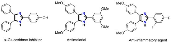 - Yar, M.; Bajda, M.; Shahzad, S.; Ullah, N.; Gilani, M.A.; Ashraf, M.; Rauf, A.; Shaukat, A. Organocatalyzed solvent free an efficient novel synthesis of 2,4,5-trisubstituted imidazoles for α-glucosidase inhibition to treat diabetes. Bioorganic Chem. 2015, 58, 65–71. [Google Scholar] [CrossRef] [PubMed]