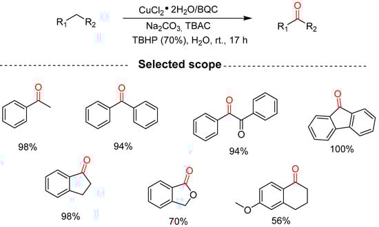 TBHP in combination with various transition metal catalysts such as Cu, Co, Cr, and Mn has been studied for benzylic oxidation as they are relatively cheap, and their reduced forms can be recycled [15,16,17]. In 2020, Ajjou and Rahman reported the oxidation of alkylarenes with aqueous 70% tert-butyl hydroperoxide catalyzed by CuCl2·2H2O/BQC and the targeted products were obtained in moderate-to-excellent yields of 56–100% (Scheme 2) [18]. This is a highly desirable green system, and the catalyst utilized is water-soluble; however, long reaction times of 17 h are required and the occurrence of side products such as t-butylperoxy ethers and benzylic alcohols detracts from this process.