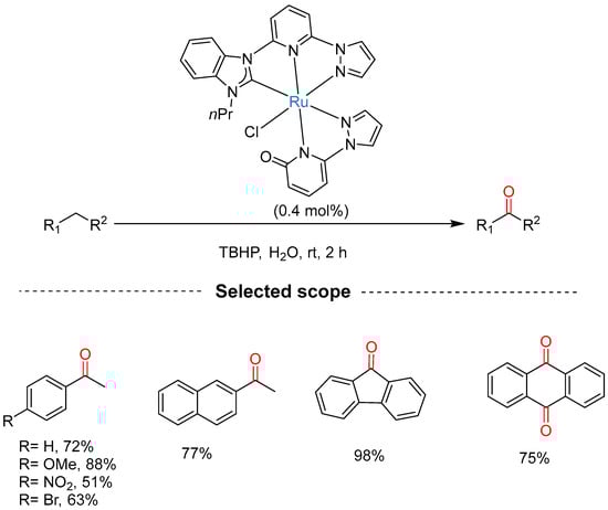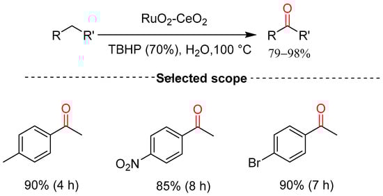 Zhao and co-workers reported the oxidation of alkylarenes to ketones using RuO2 supported on MOF-derived CeO2 as a catalyst in water in the presence of TBHP at room temperature (Scheme 4) [19]. The authors investigated substrate and scope limitations, and 16 examples of corresponding ketones were obtained in excellent yields of 79–98%. The substrates bearing electron-donating and some electron-withdrawing groups on the benzene ring gave targeted compounds in good-to-excellent yields of 85–90%, whereas those bearing electron-withdrawing nitro- and bromo- on para-position required prolonged reaction times for a complete reaction, suggesting that the electronic effect of substituents on the benzene ring affects the rate of oxidation.