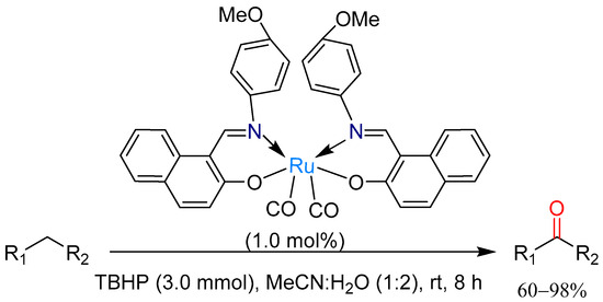 Hao and co-workers recently reported the use of ruthenium (II) carbonyl complexes bearing Schiff-base ligands as catalysts in the benzylic C–H oxidation of alkylarenes in the presence of TBHP in an acetonitrile/water solvent system at room temperature for 8 h (Scheme 5) [20]. Up to 20 examples of aromatic ketones were prepared using this easily accessible catalyst which has high catalytic activity, and targeted products were obtained in moderate to excellent (60–98%) isolated yields. This methodology was applicable to a broader substrate scope as even heterocyclic substrates were examined, furnishing the corresponding ketones in good yields (74–83%).