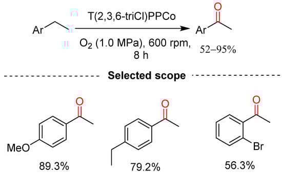 Okuda and co-workers documented the oxidation of alkylbenzenes to ketones and alcohols, using the NB4_Co−Br+Br− as the catalyst and oxone and phosphate buffer in acetonitrile at 25 °C for 2 h, and the ketone selectivity ranged from 76 to 96% [49]. Up to eight examples of ketones were synthesized; however, alcohol was obtained as a side product.