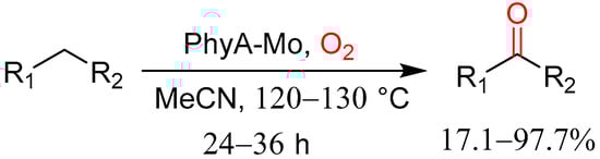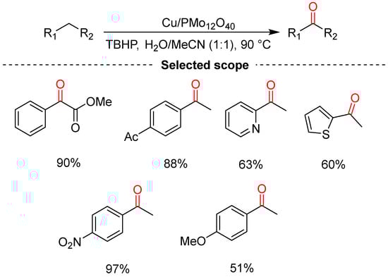 Duan and co-workers reported the oxidation of alkylarenes to aromatic ketones catalyzed by Cu/PMo12O40 in the presence of TBHP in water and acetonitrile at 90 °C for 10 h (Scheme 7) [23]. The authors investigated substrate and scope limitations, and the targeted ketones were obtained in moderate-to-good yields (51–97%). The substrates bearing electron-withdrawing groups such as -NO2 were more reactive than those bearing electron-donating groups.