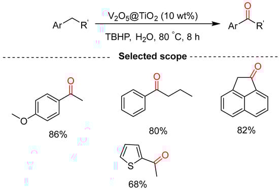 Maurya and co-workers reported the green selective oxidation of alkylbenzenes to ketones using a recyclable heterogenous catalyst, V2O5@TiO2 (Scheme 9) [35]. This was applied to a wide range of substrates and provided moderate-to-good yields of 68–94%. However, the use of stochiometric amounts of TBHP and non-commercially available catalysts which must be prepared at high temperatures for longer reaction times detracts from this method.
