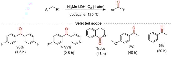 Zhou and co-workers reported the preparation of aromatic ketones from alkylarenes using the Ni2Mn-LDH as a catalyst and molecular oxygen as an oxidant in dodecane at 120 °C (Scheme 10) [36]. This system was highly substrate-specific as disubstituted substrates produced high yields in short reaction times, whereas monosubstituted substrates produced diminished yields even after prolonged reaction times at higher temperatures.