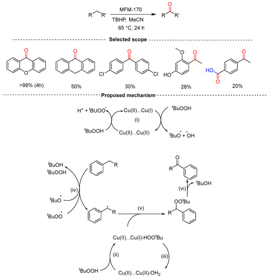 Tuna and co-workers reported the benzylic C–H oxidation of alkylarenes to corresponding aromatic ketones using MFM-170 in the presence of TBHP in acetonitrile at 65 °C for 24 h (Scheme 11) [37]. The authors tested their catalytic system on a broad range of substrates to determine its scope and limitations where bulkier substrates displayed high yields were compared to less bulkier substrates. Substrates with oxidatively sensitive groups such as -OH and -CHO were also tested, whereby the hydroxy group was retained, and the aldehyde group was oxidized to a carboxylic acid. The authors then proposed a viable mechanism after an in-depth EPR spectroscopic study and SPXRD was conducted and provided evidence for the important redox behavior of [Cu2(O2CR)4] which drives the reaction.