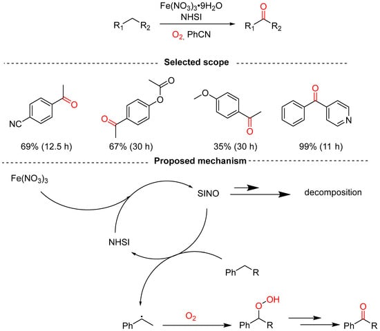 N-Hydroxyimides (NHIs) are one of the most promising organocatalysts for benzylic aerobic oxidation as it has many merits i.e., easy preparation and good catalytic performance. Yin and co-workers documented the aerobic oxidation of alkylarenes to aromatic ketones using N-hydroximide organocatalyst, Fe(NO3)3·9H2O/NHSI in benzonitrile at 90 °C and the desired products were obtained in moderate to good yields of 33–99% (Scheme 13) [39]. The authors conducted various control experiments to gain insight into the mechanism that is initiated by Fe(NO3)3 with NHSI. SINO then abstracts a hydrogen atom from the substrate to give a benzyl radical, which is then oxidized to a ketone via a peroxy intermediate.