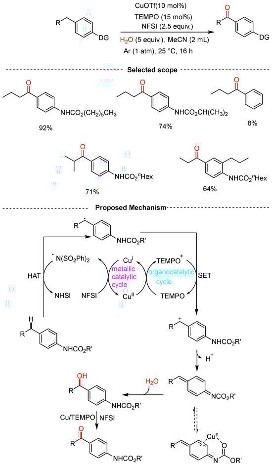Chen, Li and co-workers reported the remote carbamate-directed site-selective benzylic C–H oxygenation of alkylarenes via synergistic copper/TEMPO catalysis at room temperature in acetonitrile using water as an oxygen source at 25 °C for 16 h (Scheme 15) [41]. In the presence of a directing group in the para-position of the alkylarene, the corresponding aromatic ketones were obtained in moderate-to-high yields of 42–92%. However, in the absence of a directing group, a diminished yield of 8% was observed, thus suggesting that this system works better for alkylarenes with directing groups. The authors conducted a series of control experiments and kinetic studies to better understand the mechanism which revealed that it commences by the oxidation of the Cu(I) catalyst by NFSI which gives the imidyl NCR A along with Cu(II) species. Substrate and NCR A undergoes an HAT process to give benzyl radical, which is then oxidized by oxonium TEMPO to give benzyl cation that is stabilized by the remote carbamate directing group after tautomerization and dehydrogenation, thus generating methine cyclohexadienyl imide which consequently is trapped by water, providing benzyl alcohol. The targeted product is then furnished by Cu/TEMPO-catalyzed oxidation of benzyl alcohol.