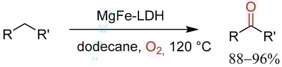 Peng and co-workers documented the oxidation of alkylarenes to aromatic ketones using MgFe-LDH as a catalyst in the presence of molecular oxygen in dodecane at 120 °C (Scheme 17) [43]. This methodology was applicable to diaryl-substituted compounds as the corresponding ketones were obtained in excellent yields of 88–96%. However, it would be useful to apply this method to monoaryl-substituted and heterocyclic substrates to determine the scope and its limitations.