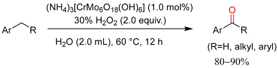 Yu and co-workers reported the selective oxidation of alkylarenes in water catalyzed by the polyoxometalate-supported chromium catalyst in the presence of hydrogen peroxide (Scheme 18) [44]. Nineteen examples of aromatic ketones were synthesized in high-to-excellent yields of 80–90% under a nitrogen-rich environment. This catalyst demonstrated high stability as it can be recycled up to six times whilst showing good activity as it can oxidize alkylarenes to various carbonyl compounds including aldehydes, carboxylic acids, etc. However, the use of a non-commercially available catalyst that has to be prepared detracts from this method.