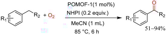 Zhao, Xuan and co-workers reported the selective oxidation of benzylic C–H bonds using molecular oxygen in the presence of a polyoxometalate-based metal–organic framework heterogeneous catalyst, POMOF-1, and NHPI in acetonitrile at 85 °C for 6 h (Scheme 20) [46]. The catalyst was synthesized via the Anderson-type reaction and the corresponding ketones were obtained in moderate to high isolated yields of 51–88%.