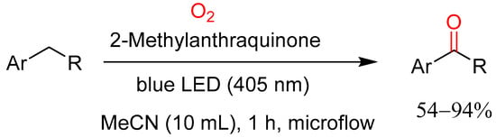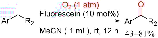 Fluorescein has attracted immense attention as an alternative to transition-metal complexes due to it having a similar ground-state excited redox potential to its transition metal counterparts [50,51]. Owing to this, Zhu and co-workers reported the photocatalyzed oxidation of benzylic C–H bonds using fluorescein as a photocatalyst in acetonitrile at room temperature for 12 h (Scheme 22) [52]. Their system was applicable to a broad substrate scope and the corresponding aromatic ketones were obtained in moderate-to-high yields of 43–81%. A gram-scale experiment was performed, and the desired product was obtained at 78% isolated yield, indicating that this is a feasible method for the industrial mass production of aromatic ketones.
