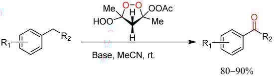 Najminejad documented the oxidation of alkyl-substituted aromatics with singlet molecular oxygen generated from trans-3,5-hydroperoxy-3,5-dimethyl-1,2-dioxolan-3-yl-ethaneperoxate in MeCN at room temperature. The corresponding ketones were obtained in high yields of 80–90% for all substrates including those bearing electron-donating and electron-withdrawing groups (Scheme 23) [53].