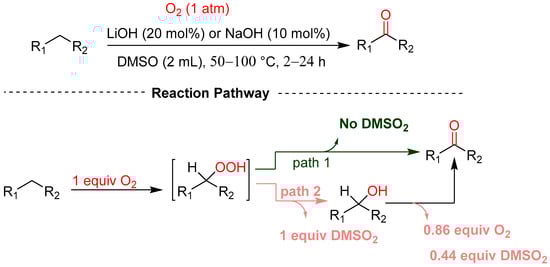 Li and co-workers reported the aerobic oxidation of (hetero) benzylic C–H bonds to aromatic ketones using molecular oxygen as an oxidant in the presence of a base in DMSO (Scheme 24) [54]. The ketones were obtained in high yields by choosing an alkalinity-matched inorganic base with the acidity of (hetero)benzylic C–H bonds. The authors proposed a reaction pathway after a series of control experiments were conducted, which revealed that the substrate reacts with a base and molecular oxygen to form a peroxide intermediate which can undergo either dehydration or reduction, and eventually furnish desired ketones in one of two ways.