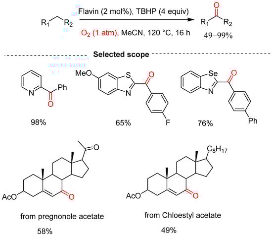 Gan and co-workers reported the het(aryl) alkane oxidation to ketones using flavin in the presence of TBHP under oxygen-rich environment in acetonitrile at 120 °C for 16 h (Scheme 25) [55]. The authors examined the scope and its limitations, which revealed that this system was applicable to a wide range of substrates and the ketones were obtained in moderate-to-excellent yields (49–99%). Various intermediates that are utilized in the preparation of biologically important compounds were synthesized, such as the intermediate from pregnenolone acetate which was furnished with a 58% isolated yield. However, the use of higher temperatures and longer reaction times detracts from this process.