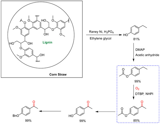 Liu and co-workers developed a catalytic strategy for the conversion of lignin to several pharmaceutical intermediates based on selective depolymerization to generate 4-ethylphenol followed by benzylic C–H oxidation with molecular oxygen to furnish 4-acetoxyacetophenone as a key intermediate for the synthesis of various pharmaceutical intermediates (Scheme 26) [56]. Raney nickel and a strong acid was used as a catalyst for the depolymerization and a green benzylic C–H oxidation using environmentally benign O2 as the oxidant afforded the key intermediate in 85% yield.
