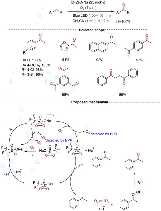 Visible light photocatalysis has received enormous attention in organic synthesis due to its simplicity, economic, and environmental friendliness [57,58]. On that note, Fu and co-workers reported light and oxygen-enabled sodium trifluoromethanesulfinate-mediated selective oxidation of C–H bonds allowing for the preparation of aromatic ketones from readily available alkyl arenes (Scheme 27) [59]. Their methodology was applicable to a wide range of substrates such as neutral, electron-rich, and electron-donating with excellent yields of 95–100% at room temperature for 12 h. This system was also applied to a heterocyclic substrate and produced the corresponding ketone in a moderate 51% yield. Alkyl-containing arenes were also investigated and it was found that the length of the alkyl chain and substituent variation on alkyl did not affect the reactivity of the substrates. The authors proposed a radical mechanistic pathway which was confirmed by electron paramagnetic resonance. The initial light irradiation of the catalyst produces an excited state and an SET of the excited state to oxygen generates two radicals. The radical obtained from the catalyst would then react with the substrate to create a benzyl radical which, upon reaction with oxygen, would give a peroxide which undergoes dehydration to furnish the desired ketones.