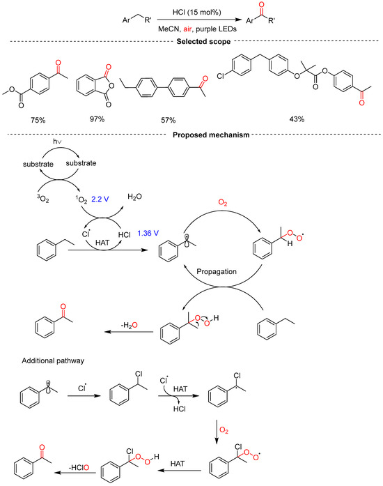 - Niu, K.; Shi, X.; Ding, L.; Liu, Y.; Song, H.; Wang, Q. HCl-Catalyzed Aerobic Oxidation of Alkylarenes to Carbonyls. ChemSusChem 2022, 15, e202102326. [Google Scholar] [CrossRef] [PubMed]