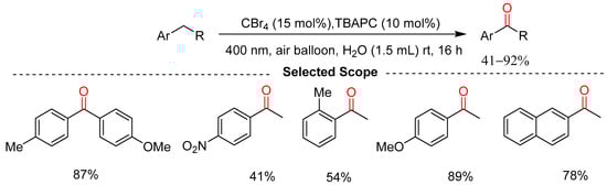 - Bo, C.; Li, M.; Chen, F.; Liu, J.; Dai, B.; Liu, N. Visible-Light-Initiated Air-Oxygenation of Alkylarenes to Carbonyls Mediated by Carbon Tetrabromide in Water. ChemSusChem 2024, 17, e202301015. [Google Scholar] [CrossRef] [PubMed]
