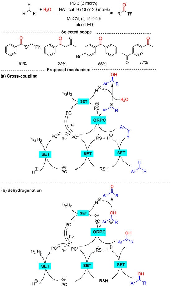 - Nguyen, K.; Nguyen, V.; Tran, H.; Pham, P. Organo-photocatalytic C–H bond oxidation. an operationally simple and scalable method to prepare ketones with ambient air. RSC Adv. 2023, 13, 7168–7178. [Google Scholar] [CrossRef]