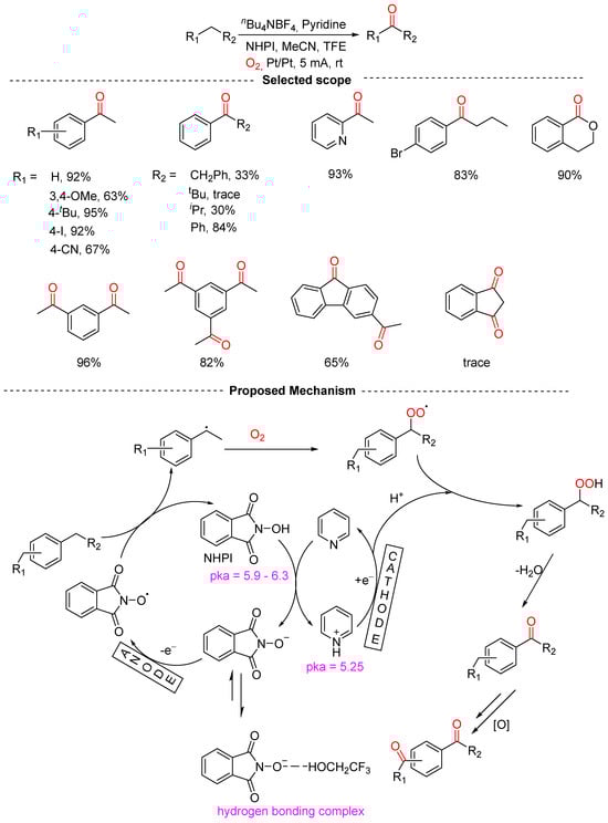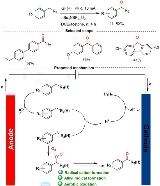 - Xu, Y.; Wang, J.; Xing, J.; Bai, T.; Wang, D.; Zhou, P. Electrochemically driven aerobic oxygenation of alkylarenes to carbonyl compounds. Mol. Catal. 2023, 550, 113614. [Google Scholar] [CrossRef]