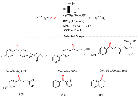 - Xue, M.; Pan, T.; Shao, Z.; Wang, W.; Li, H.; Zhao, L.; Zhou, X.; Zhang, Y. Sustainable Electrochemical Benzylic C–H Oxidation Using MeOH as an Oxygen Source. ChemSusChem 2024, 17, e202400028. [Google Scholar] [CrossRef]