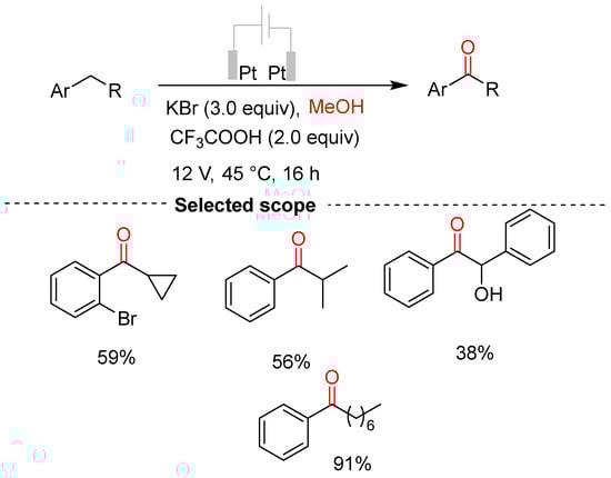 - Kong, J.; Zhang, F.; Zhang, C.; Chang, W.; Liu, L.; Li, J. An efficient electrochemical oxidation of C(sp3)–H bond for the synthesis of arylketones. Mol. Catal. 2022, 530, 112633. [Google Scholar] [CrossRef]