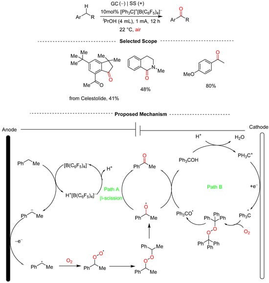 - Zhang, Z.; Lv, Y.; Ji, L.; Chen, P.; Han, S.; Zhu, Y.; Li, L.; Jia, Z.; Loh, T.-P. Triaryl Carbenium Ion Pair Mediated Electrocatalytic Benzylic C–H Oxygenation in Air. Angew. Chem. Int. Ed. 2024, 63, e202406588. [Google Scholar] [CrossRef] [PubMed]