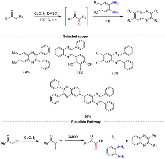 - Kong, L.; Meng, J.; Tian, W.; Liu, J.; Hu, X.; Jiang, Z.-H.; Zhang, W.; Li, Y.; Bai, L.-P. I2-Catalyzed Carbonylation of α-Methylene Ketones to Synthesize 1,2-Diaryl Diketones and Antiviral Quinoxalines in One Pot. ACS Omega 2022, 7, 1380–1394. [Google Scholar] [CrossRef] [PubMed]
