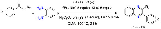 - Tao, Y.; Zhang, J.; Hu, Y.; Liu, H.; Sun, J.; Liu, L. Electrosynthesis of Quinoxalines via Intermolecular Cyclization/Dehydrogenation of Ketones with o-Phenylenediamines. Synlett 2024, 35, A–F. [Google Scholar] [CrossRef]