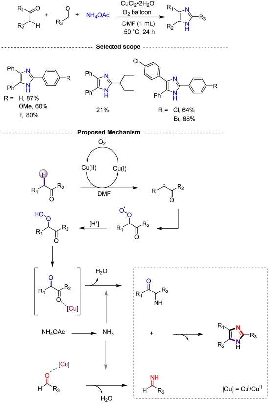 - Jayram, J.; Jeena, V. Copper-catalyzed aerobic benzylic sp 3 C–H oxidation mediated synthesis of 2, 4, 5-trisubstituted imidazoles via a domino multi-component reaction. Green Chem. 2017, 19, 5841–5845. [Google Scholar] [CrossRef]
