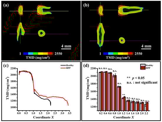 Three-dimensional color maps of micro-CT scans of (a) healthy primary teeth and (b) HPP primary teeth. (c) Plots of TMD with coordinate X. (d) Comparison of TMD variations between healthy and HPP primary teeth (n.s.—not significant).