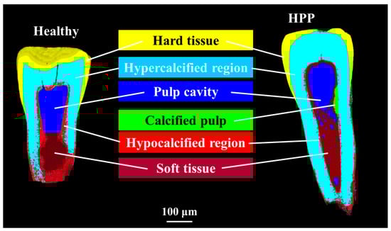 Nano-CT images and 3D color maps of the investigated incisors are shown in Figure 2. In the HPP sample, the relative volume of calcified tissue and soft tissue in the pulp was significantly higher than that in the healthy one.