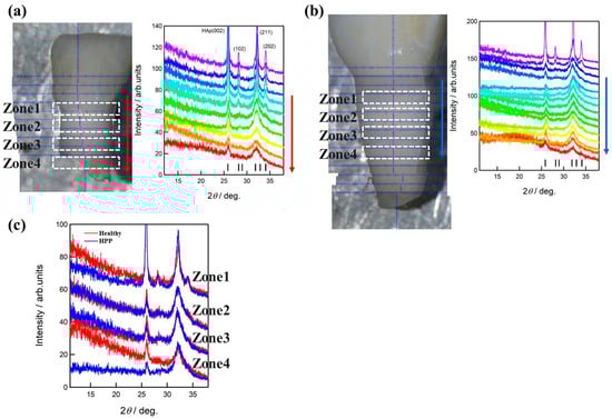 XRD patterns at different locations of (a) healthy primary teeth and (b) HPP primary teeth. The patterns approach the root according to the direction of the arrows. (c) Comparison of the patterns in different regions shown by the dashed lines.