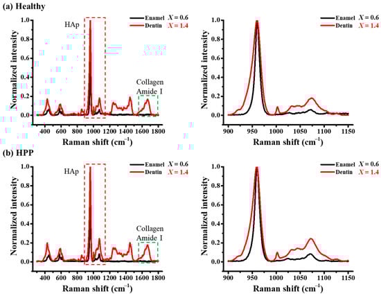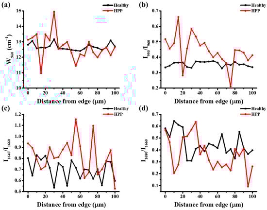 Data on healthy dentin were only available up to X = 2.2–2.6, because of the loss of the roots. As can be seen in Figure 1c,d, TMD remained almost constant in the enamel region, while it rapidly and markedly decreased across the DEJ and tended to be insignificantly varied in dentin. In addition, compared to healthy teeth, HPP samples showed a relatively higher TMD at around X = 1.2. Raman spectroscopic line scan was used to further analyze the molecular structural variation in the tooth root induced by HPP.