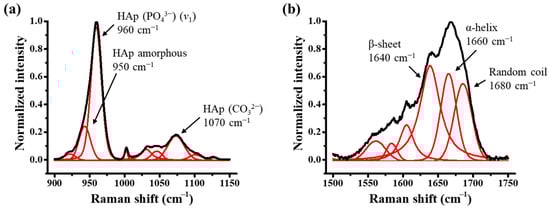 Spectral deconvolution of Raman spectra related to (a) apatite and (b) collagen at X = 1.4.