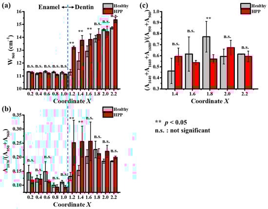 Typical Raman spectra of enamel and dentin for healthy and HPP teeth are shown in Figure 4. In the enamel region, Raman peaks were observed in the range < 1100 cm−1, which indicated the vibrations of PO4 in HAp, while in dentin, several additional bands induced by collagen appeared at higher wavenumbers. Figure 5a shows a representative spectral deconvolution of the v1 mode originating from a P–O stretching vibration, which includes a strong band at around 960 cm−1, indicating the crystalline phase of HAp, and a sub-band at around 950 cm−1, indicating the amorphous phase of HAp [,]. In dentin, the bands of Amide III (1200–1300 cm−1), Amide II (1400–1500 cm−1), and Amide I (1600–1700 cm−1) were all attributed to collagen proteins. Amide I exhibits several sub-bands attributed to a β-sheet (1640 cm−1), an α-helix (1660 cm−1), and a random coil (1680 cm−1) (cf. Figure 6b). No collagen bands were identified as the enamel was composed of approximately 96% HAp. The full width at half maximum (FWHM) of 960 cm−1 (W960) was used to indicate HAp crystallinity, because smaller values of W960 indicate higher crystallinity [,,]. Furthermore, as a band indicative of carbonate apatite appeared at 1070 cm−1, the carbonate apatite content could be evaluated using A1070/(A950 + A960), that is, the ratio of the carbonate-related band area to the sum of the band areas of the amorphous and crystalline phases of HAp []. The collagen content relative to apatite was evaluated by (A1640 + A1660 + A1680)/(A950 + A960). These Raman data plots against the coordinate X are shown in Figure 6. W960 showed a pronounced increase in dentin (i.e., X > 1), especially at X = 1.2, 1.4, and 1.6 for HPP teeth, indicating a significantly lower crystallinity of HAp (Figure 6a). In addition, the carbonate apatite content also increased significantly in these areas on HPP teeth with respect to the healthy cases (Figure 6b). Therefore, this suggests that HPP may result in a decrease in HAp crystallinity and an increase in carbonate apatite in the area close to the dentin–enamel junction (DEJ) of dentin. Concerning the variation of collagen content, the areal ratio of (A1640 + A1660 + A1680)/(A950 + A960) showed insignificant variation (cf. Figure 6c), indicating a negligible variation in dentin collagen induced by HPP.