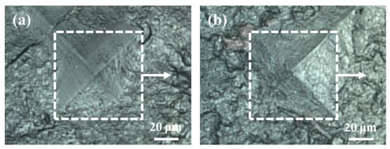 Microscopic images around Vickers indentation on (a) healthy primary teeth and (b) HPP primary teeth. The arrows and dashed squares show the orientation of the Raman scan and indentation zone, respectively.