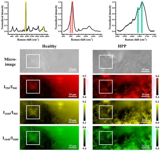 Microscope imaging and Raman imaging of different intensity ratios around the indentation generated for HPP and healthy teeth. The white squares show indentation zones. The color bars in the spectra correspond to the colors of Raman images.