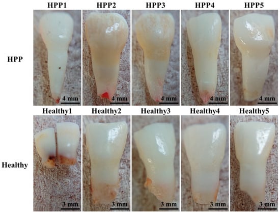 Optical images of the investigated healthy and HPP primary teeth. Healthy1 was damaged after micro-CT imaging, but other results were not affected.