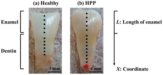 In this study, Raman spectra were acquired on a line from the enamel of the crown to the “dentin” (covered with cementum) of the root of the test teeth. Figure 11 shows a typical image of the acquisition points for the collection of Raman spectra of healthy and HPP teeth. The apex of the crown was set as the origin, and the distance from the origin was x. Accordingly, to minimize the influence of the difference in tooth length, a new coordinate was specified by X = x/L (L: the length of the enamel), because the ratio of enamel length to entire tooth length could be taken to be constant. The Raman spectra of enamel were acquired from five points at coordinates X = 0.2, 0.4, 0.6, 0.8, and 1.0. In addition, the Raman spectra of dentin were obtained from six points (X = 1.2, 1.4, 1.6, 1.8, 2.0, and 2.2). A high-resolution laser Raman microscope (T-64000, Horiba/Jobin-Yvon, Kyoto, Japan) equipped with a 1024 × 256 pixels charge-coupled device (CCD) camera (CCD-3500V, Horiba Ltd., Kyoto, Japan) and a laser with an excitation wavelength of 488 nm (Sapphire SF NX CDRH Controller, Coherent, Inc., Saxonburg, PA, USA) was used for the Raman measurements. To acquire Raman spectra, the laser output was set to 60 mW, with a pinhole aperture of 100 μm and an objective lens of ×100 magnification. The laser exposure time for the collection of a spectrum was 30 s with a totalization frequency of three times. The obtained Raman spectra were subjected to baseline subtraction and automatically deconvoluted into Gaussian–Lorentzian sub-bands. The baseline subtraction and the deconvolution procedure were performed according to the same criteria for all spectra collected on all teeth, using options available in commercial software (LabSpec 5, Horiba/Jobin-Yvon, Kyoto, Japan).