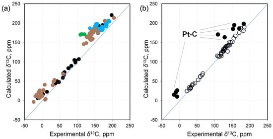 Correlation of calculated (PBE0/{6-311G(2d,2p); Pt(SDD)}//PBE0/{6-31+G(d); Pt(SDD)}) versus experimental 13C NMR shifts for Pt complexes: (a) C-Pt carbons for all title complexes (brown—carbons covalently bonded to platinum, blue—NHC carbons, green—NHC carbons in Pt(IV) complexes, black—others); (b) all carbons for complexes 10–11, 39, 59, 67 (filled circles—carbon atoms directly bound to platinum, empty—all other atoms in the complex).