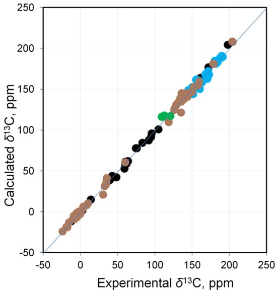 where δ is the calculated CS for a particular nucleus, and the intercept (−0.9) and slope (1.06) are scaling factors. The intercept fixes the error for a reference compound, while the slope helps to correct the systematic errors. Thus, the application of this procedure allows for the evaluation of 13C CSs in Pt complexes with RMSE = 3.7 ppm.