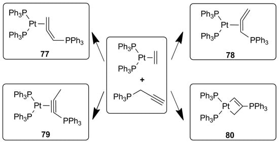 - Colebatch, A.L.; Cade, I.A.; Hill, A.F.; Bhadbhade, M.M. η2-Allenyl- and η2-Alkynylphosphonium Complexes of Platinum. Organometallics 2013, 32, 4766–4774. [Google Scholar] [CrossRef]